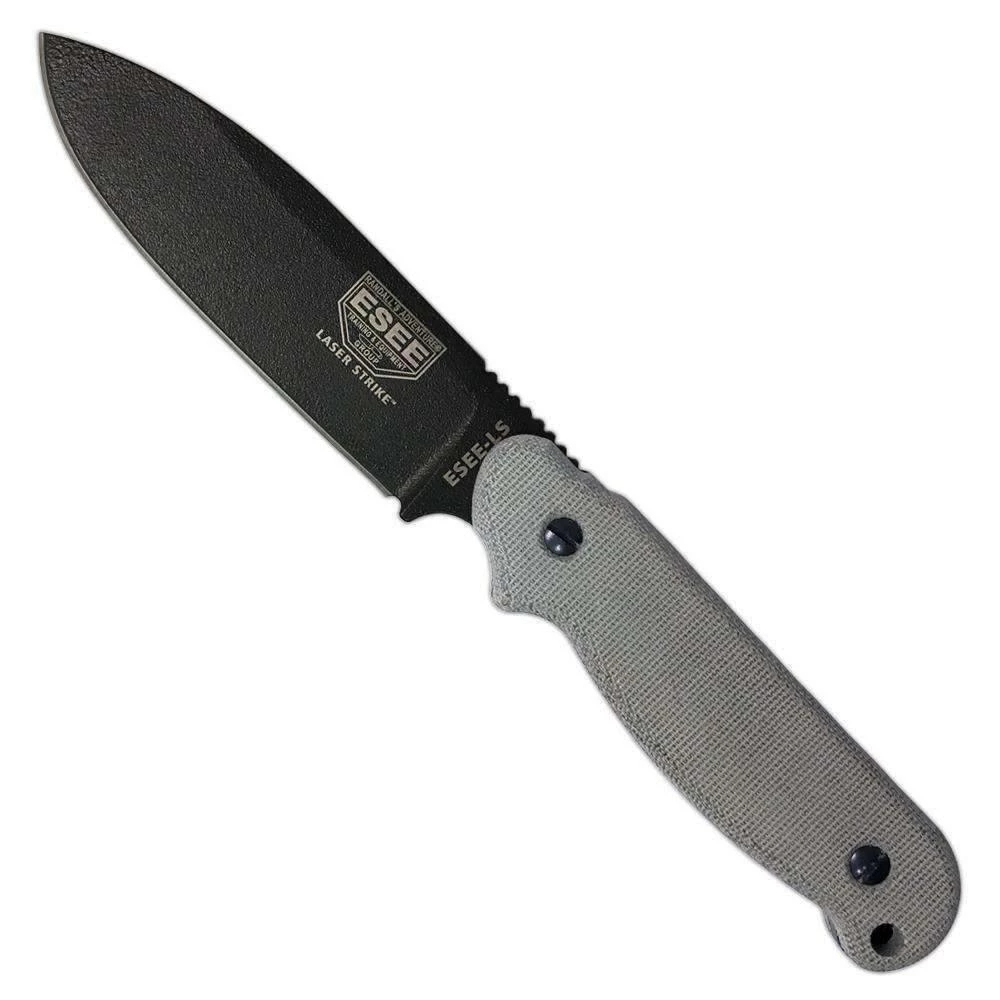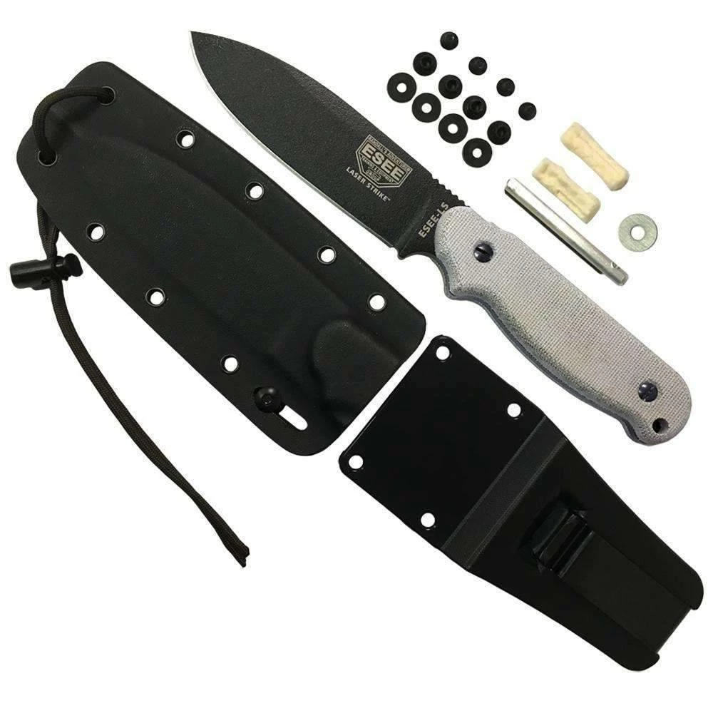 The ESEE Knives Laser Strike Survival Knife Fixed 5″ Blade is the perfect outdoor/surival tool and has a fire steel and tinder tabs in Micarta Handles, Kydex Sheath.