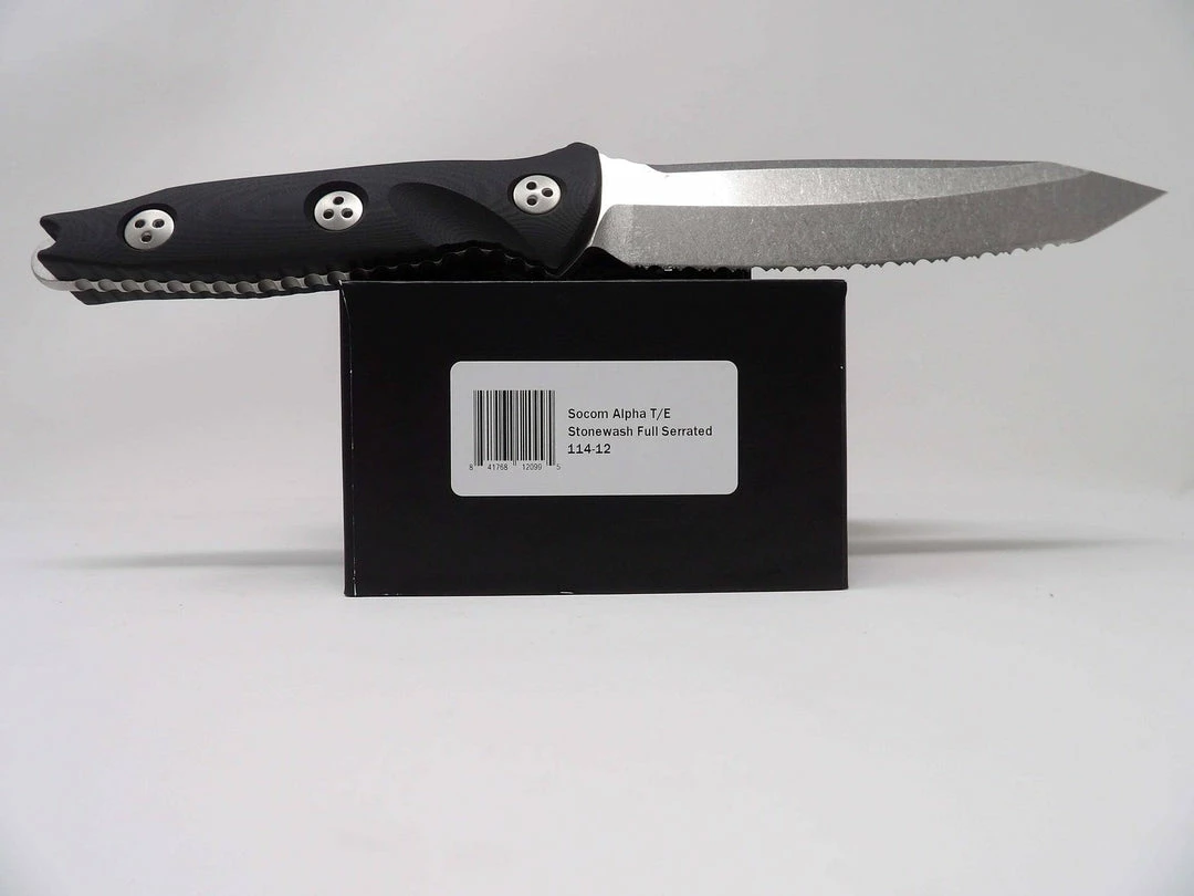 Microtech Socom Alpha Tanto Fixed Blade Knife Black handle, Stonewash Full Serrated 114-12