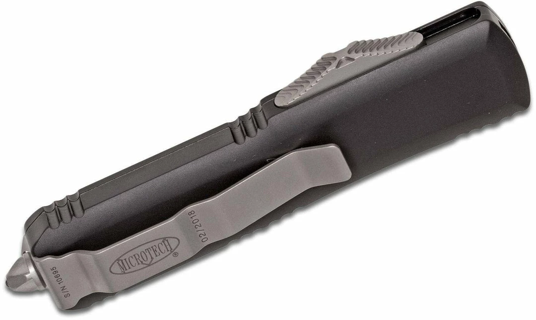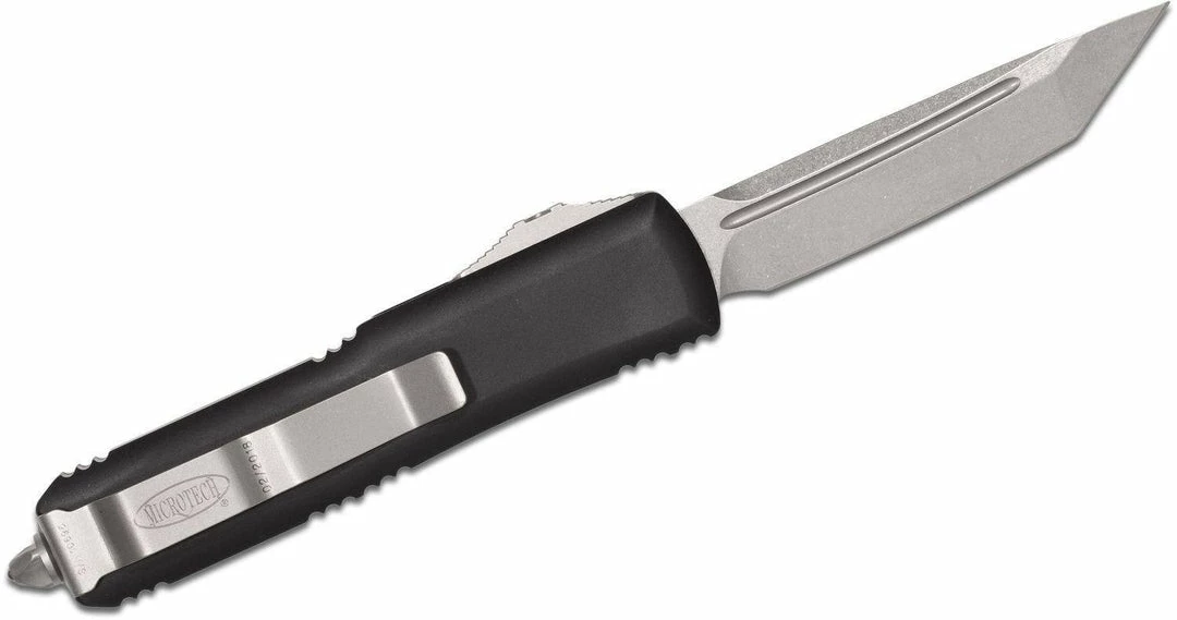 Microtech UTX-85 AUTO OTF 3″ Stonewashed Tanto Plain Blade, Black Aluminum Handles (Model 233-10)