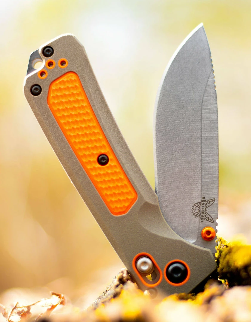 The Benchmade Grizzly Ridge, based on the highly regarded Grizzly Creek folder, changes up the formula with a grip-enhancing dual durometer handle, a blade for all-around hunting utility, and a fully ambidextrous design. Its blade is made from premium CPM-S30V stainless steel with a slight recurve and strategically placed jimping on the spine. This lightweight, orange accented folder is the perfect fit for everyday carry and hunting tasks alike.