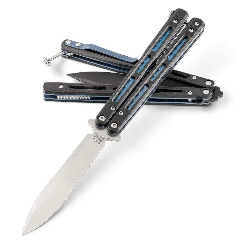 The Benchmade Balisong 51 Knife is a larger version of the Benchmade Balisong 32 and one of the most popular butterfly knives around. The 51 Morpho Balisong Butterfly features a premium D2 steel blade with black G10 handles. The hand polished hardware, jeweled blue titanium liners and Ti carry-clip provide the perfect accent to this great Butterfly Knife.