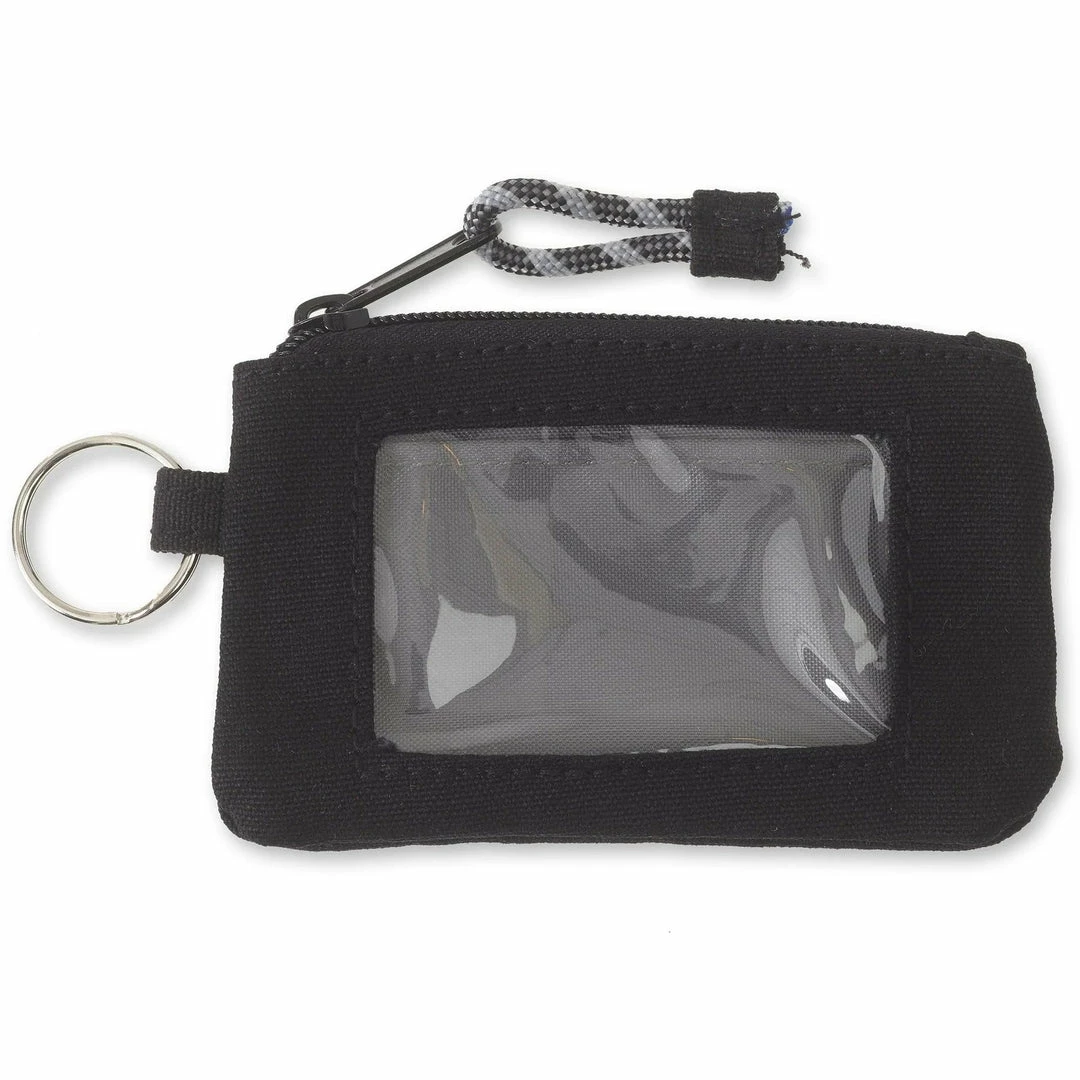 Double sided wallet with metal key ring, zip compartment with ID window and rope loop zip pull.