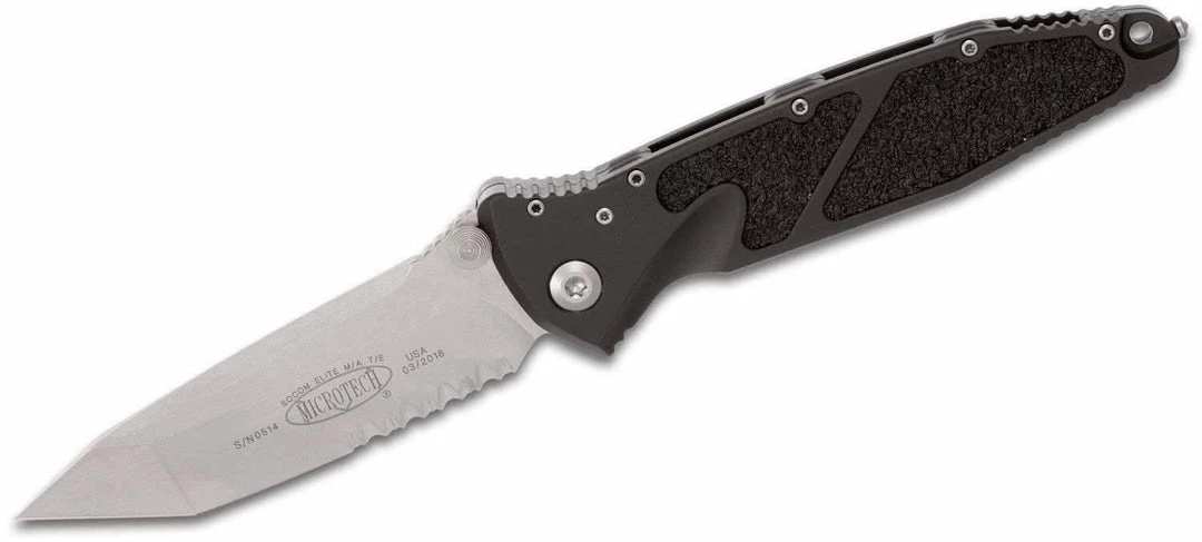 This Socom Elite manual folding knife has a black aluminum handle and a partially serrated, stonewashed tanto blade. Since the creation of the original, the Microtech Socom has been setting the standard for tactical/utility cutlery. The Socom Elite builds on this design to adapt to a variety of different environments. Its handle sports grip inserts and a unique shape that molds to your hand for a comfortable and secure grip at all times. Features: Lightweight, ergonomic aluminum handle with grip-enhancing inserts. Secure tip-down pocket clip, lanyard hole, and glass breaker tip. Bohler M390/204P blade with dual thumb studs for easy one-handed deployment