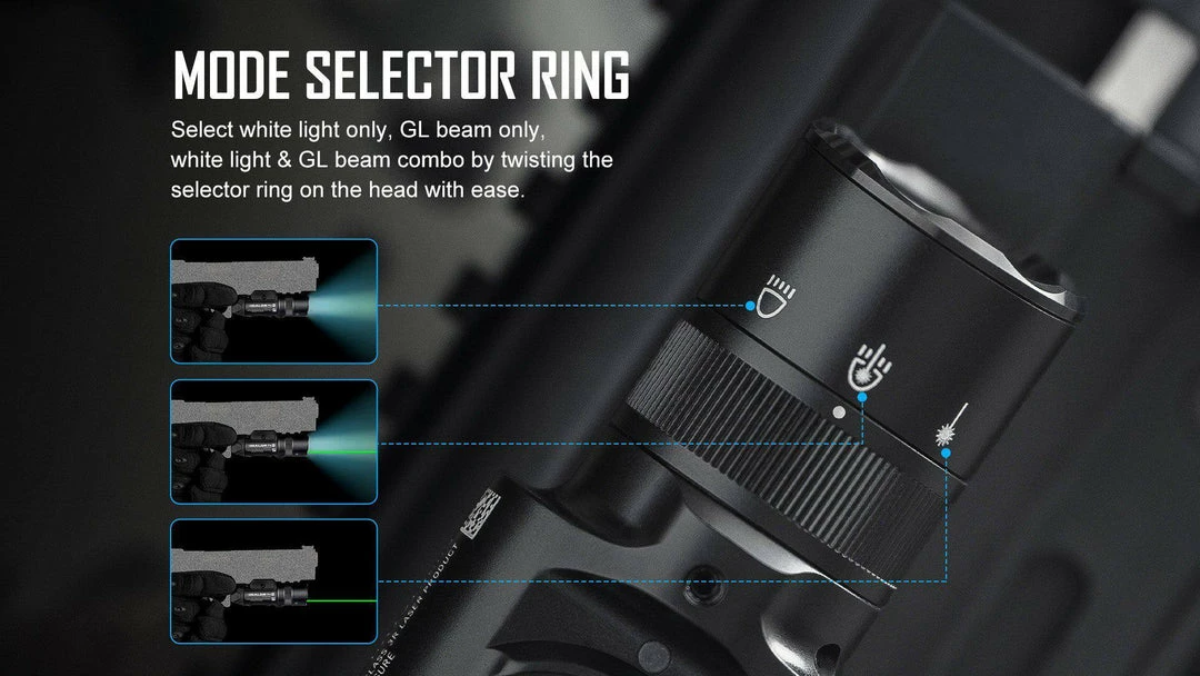 - New Mode Selector Ring: Switch between 3 light modes quickly with the turn of a selector ring. Choose between white light only, green laser only, or white light & green beam with ease!