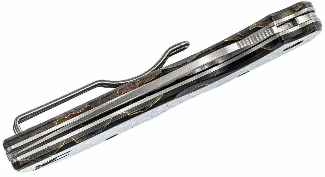 The C152RNP Chaparral Raffir Noble features stainless steel liners and smoke-colored Raffir Noble scales. Manufactured in Denmark, Raffir is a strikingly beautiful composite material that encapsulates metal mesh in a translucent epoxy resin. Raffir Noble combines a smoke-colored acrylic with brass and copper wire mesh to yield a unique, semi-transparent, three dimensional pattern. All other details of this knife are consistent with the Chaparral family, including a full-flat-ground CTS XHP blade, a sturdy lockback mechanism, and a reversible deep-pocket wire clip positioned for tip-up carry.