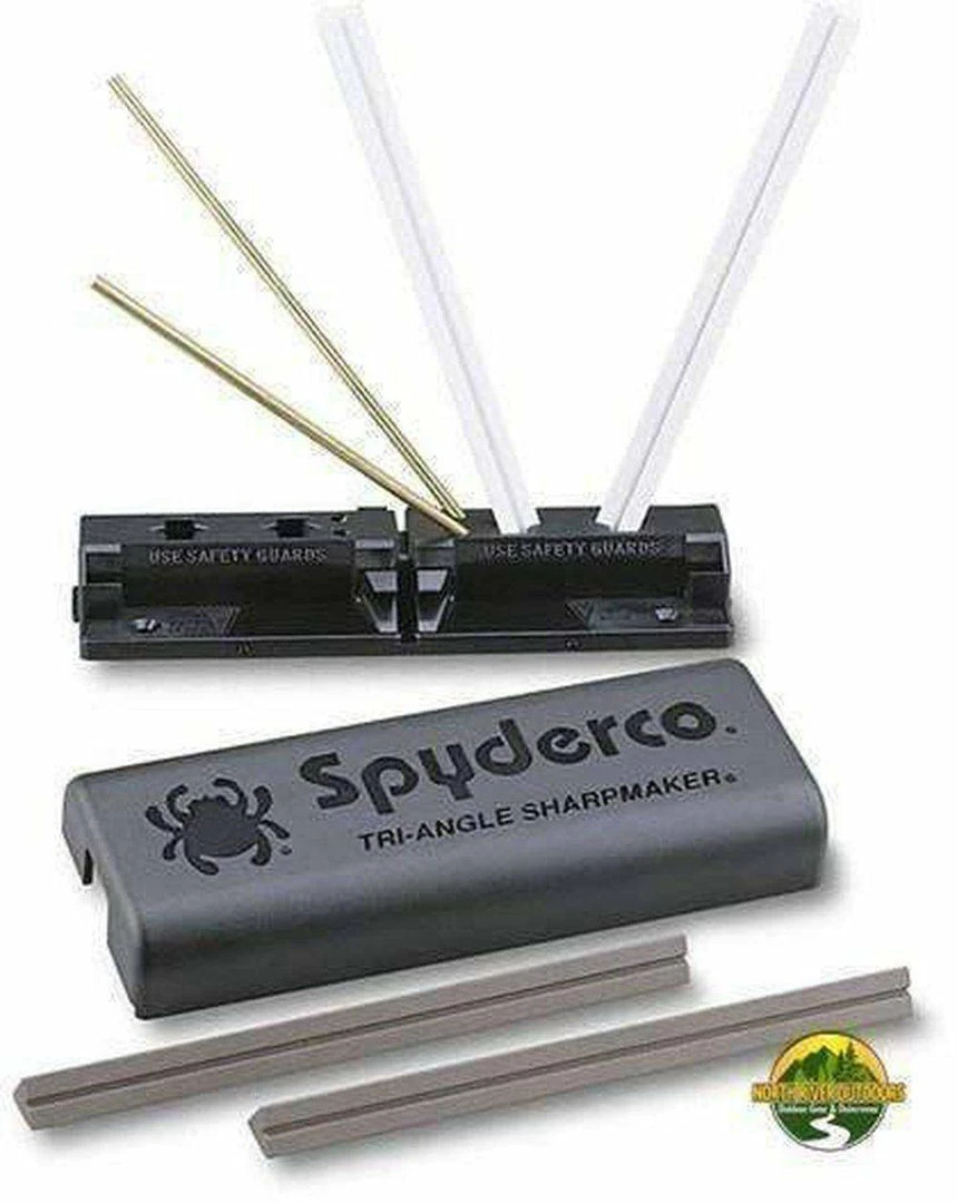 The key to sharpening any cutting tool is removing the steel at the edge while maintaining a consistent angle between the blade and the stone. Spyderco’s Tri-Angle Sharpmaker takes the mystery out of this process and enables anyone to sharpen a knife effectively with just a few minutes’ practice. Its durable ABS plastic base contains keyed holes that accurately set the stones’ sharpening angles at a 30° (15° each side) or 40° (20° each side) for sharpening knives. Simply keep the plane of your knife’s blade vertical and draw the edge along each stone to sharpen. It’s that simple. For serrated blades, use the rounded edges of the stones and a slightly looser grip to allow the stone to flow into the recesses of each serration. The Sharpmaker system includes two sets of high alumina ceramic stones: a pair of medium-grit (brown) stones for aggressive sharpening and a set of fine (white) stones for professional-grade finishing. A set of brass safety rods protects your hands while sharpening and all components snap into the self-contained ABS plastic base and lid for easy storage. Every Sharpmaker comes complete with a detailed instruction book and DVD that guides you step by step through the process of sharpening knives, scissors, awls, and many other tools.