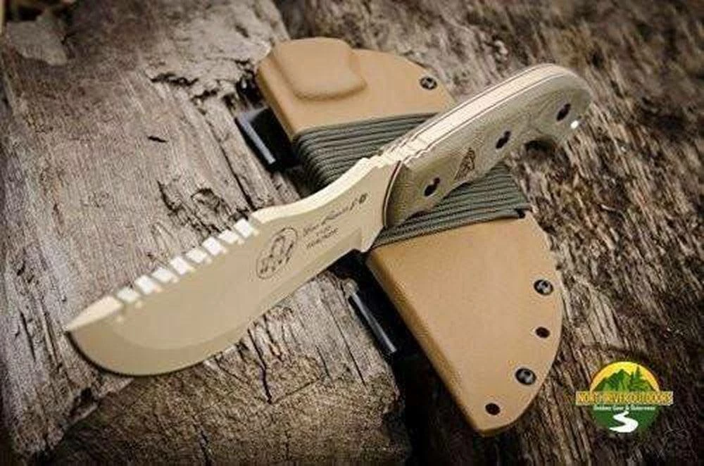 Designed by Tom Brown and featured in the movie “The Hunted” as well as the cover of BLADE Magazine, this is one of the most versatile survival knives ever made. It is designed to chop, saw, skin, engrave, break wire and more. It is made from thick carbon steel and features a milled Micarta handle and tough Kydex sheath. Your chopping pressure can be varied by holding the handle at different points. The knife is made entirely in the USA. One of the most popular knives from TOPS, the Tom Brown Tracker speaks for itself.