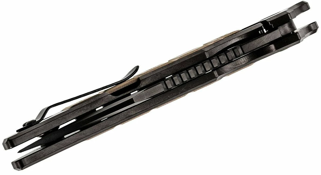 The titanium handle is also DLC coated and bead blasted to extend the matte look. The 0223 has a sturdy titanium frame lock with a hardened steel lockbar insert for reliable lockup. ZT’s KVT ball-bearing system, combined with a highly ergonomic flipper, make the 0223 quick and easy to open, too. The 0223’s earth brown G10 handle scales are reminiscent of the original military knife’s stacked leather handle. The G10 scales wrap around to the top of the handle and meet in the middle to provide a comfortable and secure grip—as well as helping to keep debris out of your knife.